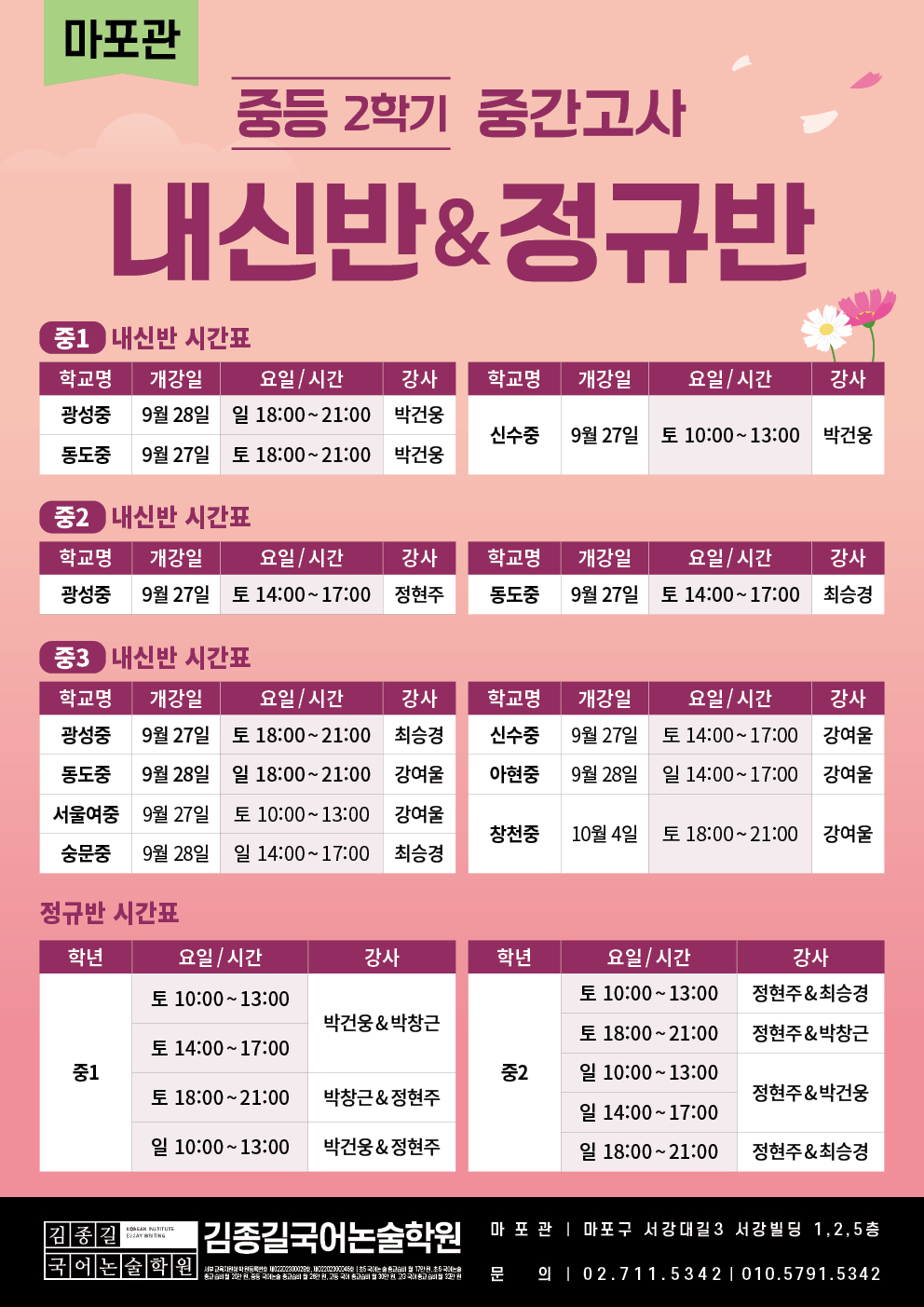 [마포관] 중등 2학기 중간고사 내신 시간표