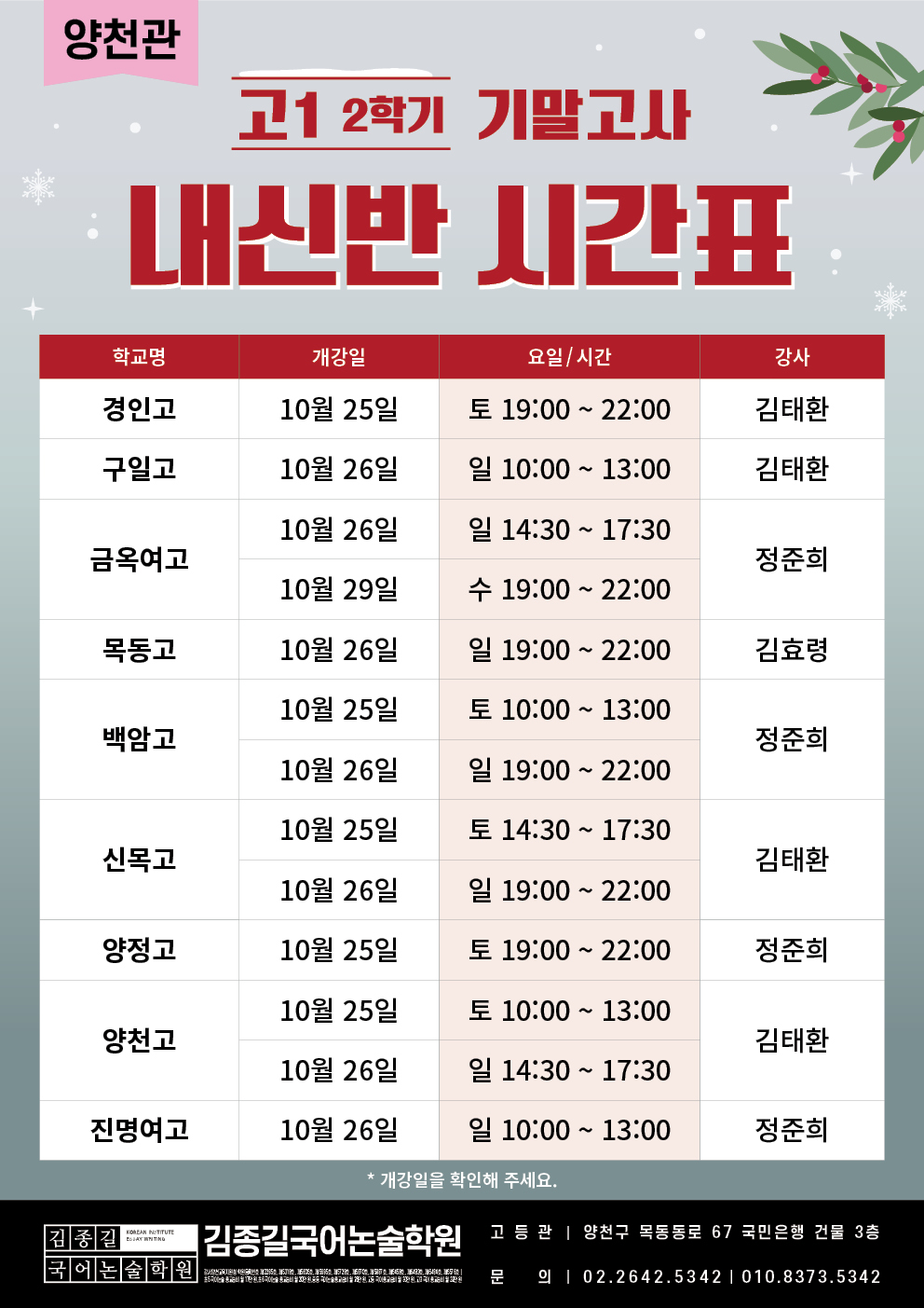 [양천관] 고1 2학기 기말고사 내신 시간표