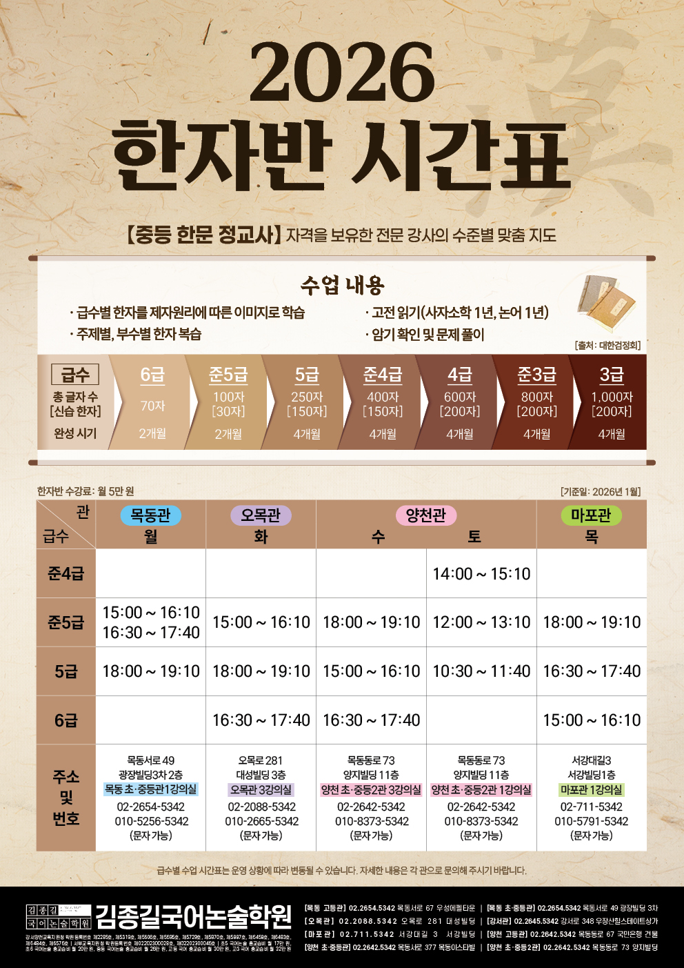 기초 한자부터 한자능력검정 대비까지 체계적인 수업을 진행합니다.