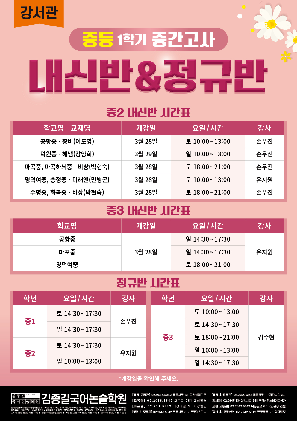[강서관] 중등 1학기 중간고사 내신반&정규반 시간표