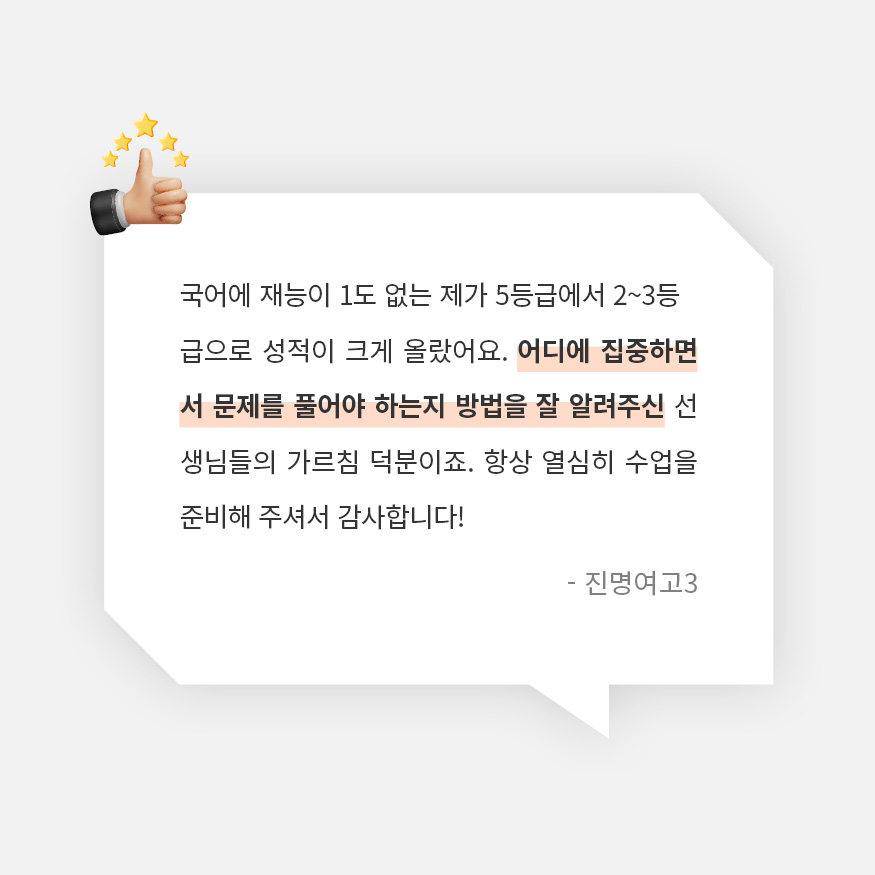 유연하게 사고하고 단단하게 지키는 내 점수 • 9월 모평 이후 체계화된 수능 출제 방향 예측을 통한 족집게 마무리 • 50일 남은 이 시점, 마냥 어렵기만 하면 시간도 아깝고 멘털도 깨진다. 반드시 짚고 넘어가야 할 필수 작품, 꼭 보아야 할 지문 숙제로 효율적 마무리 유도 |