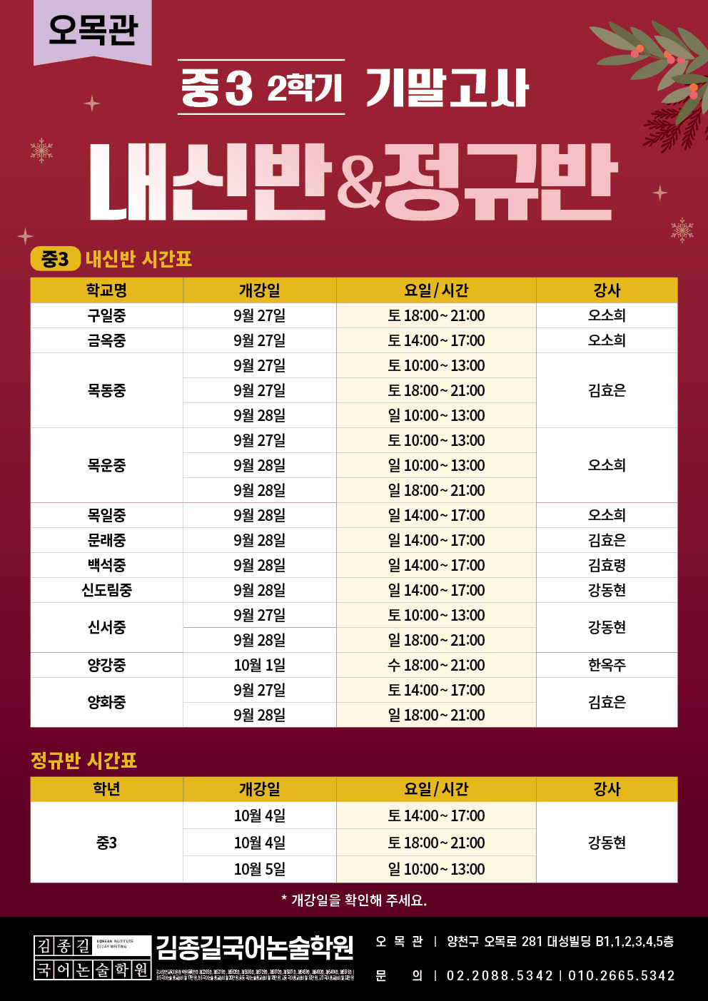 [오목관] 중3 2학기 기말고사 내신 시간표
