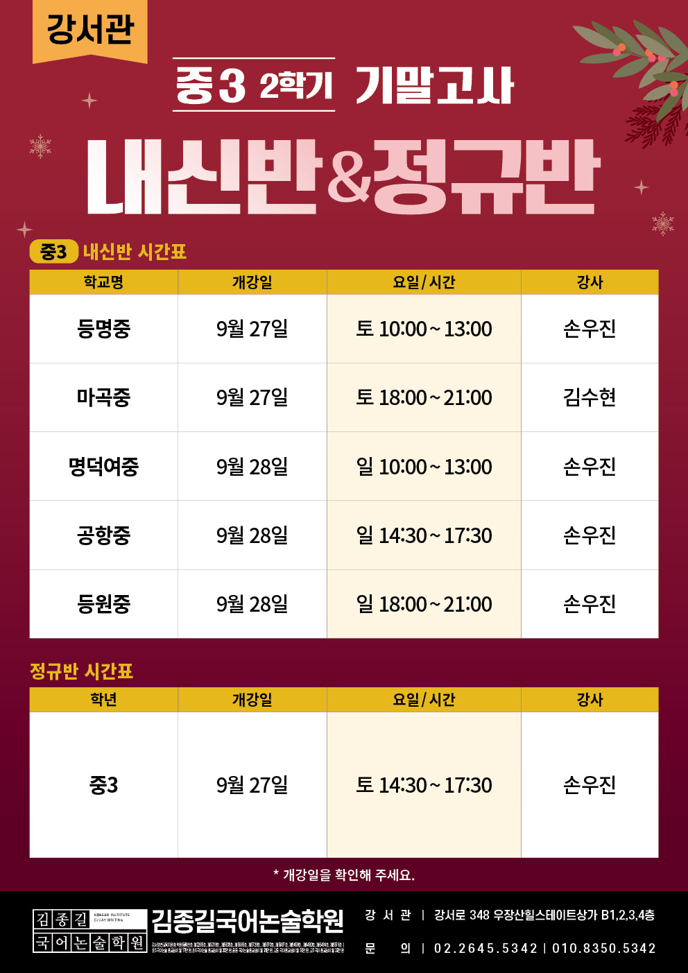 [강서관] 중3 2학기 기말고사 내신 시간표
