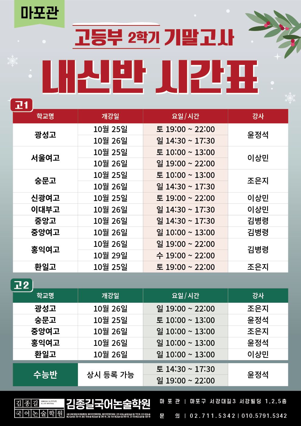 [마포관] 고등 2학기 기말고사 내신 시간표
