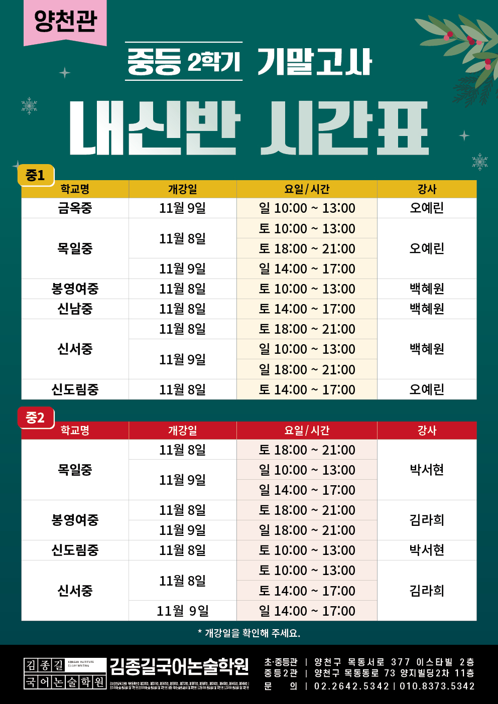 [양천관] 중등 2학기 기말고사 내신 시간표