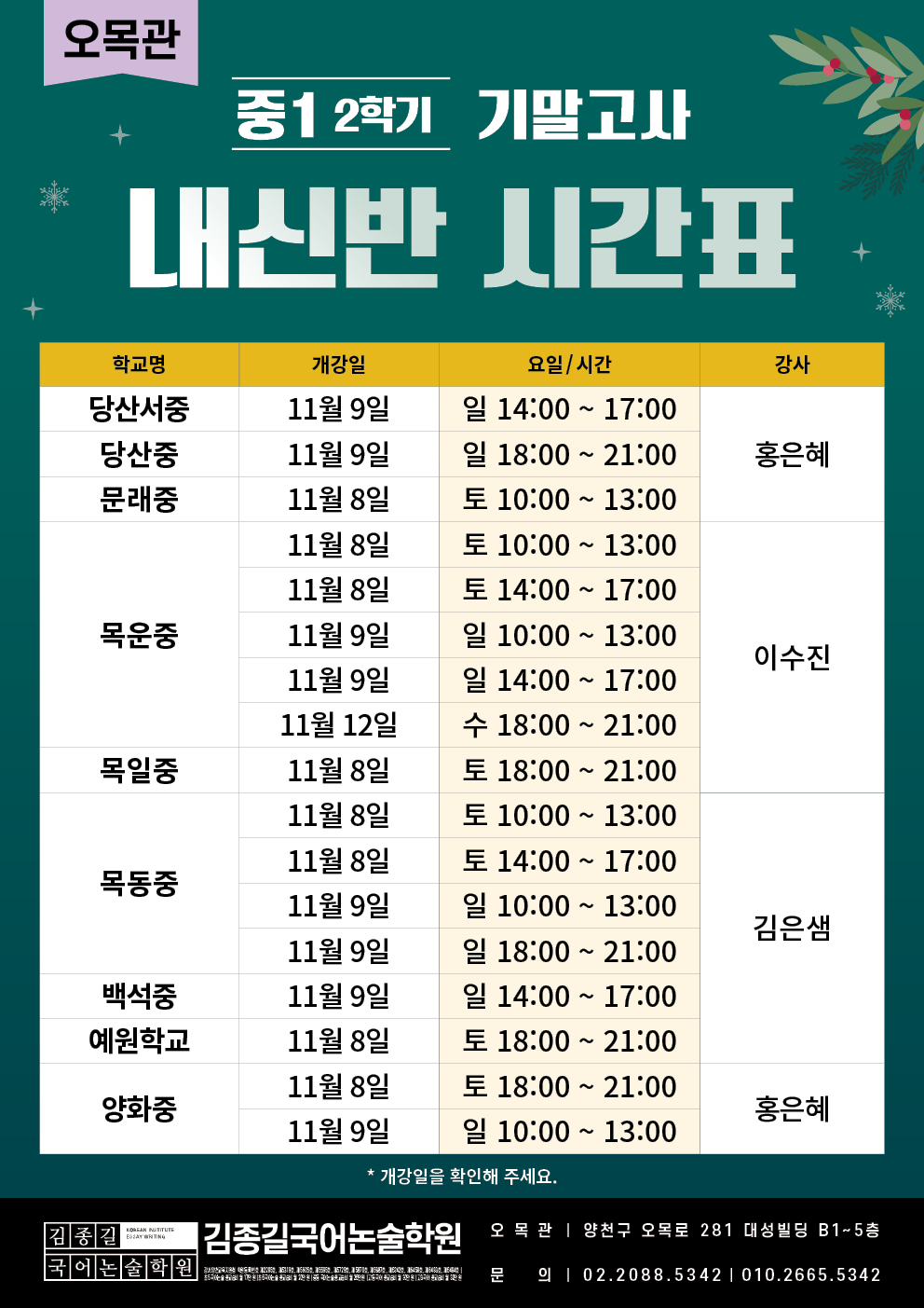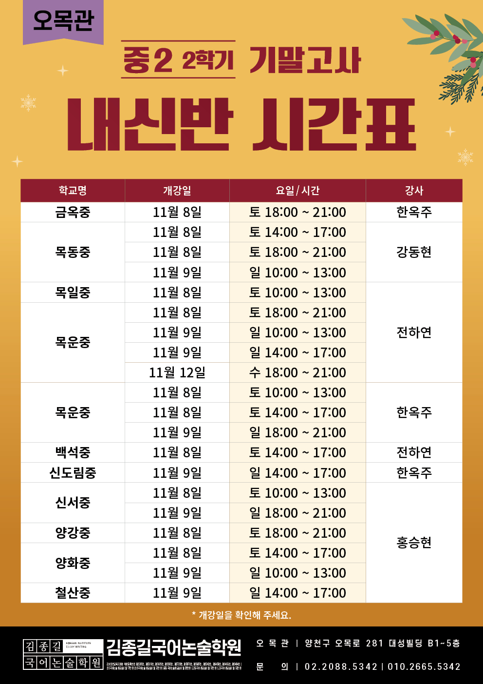 [오목관] 중등 2학기 기말고사 내신 시간표