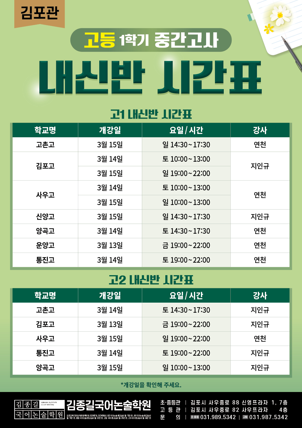 [김포관] 고등 1학기 중간고사 내신반 시간표