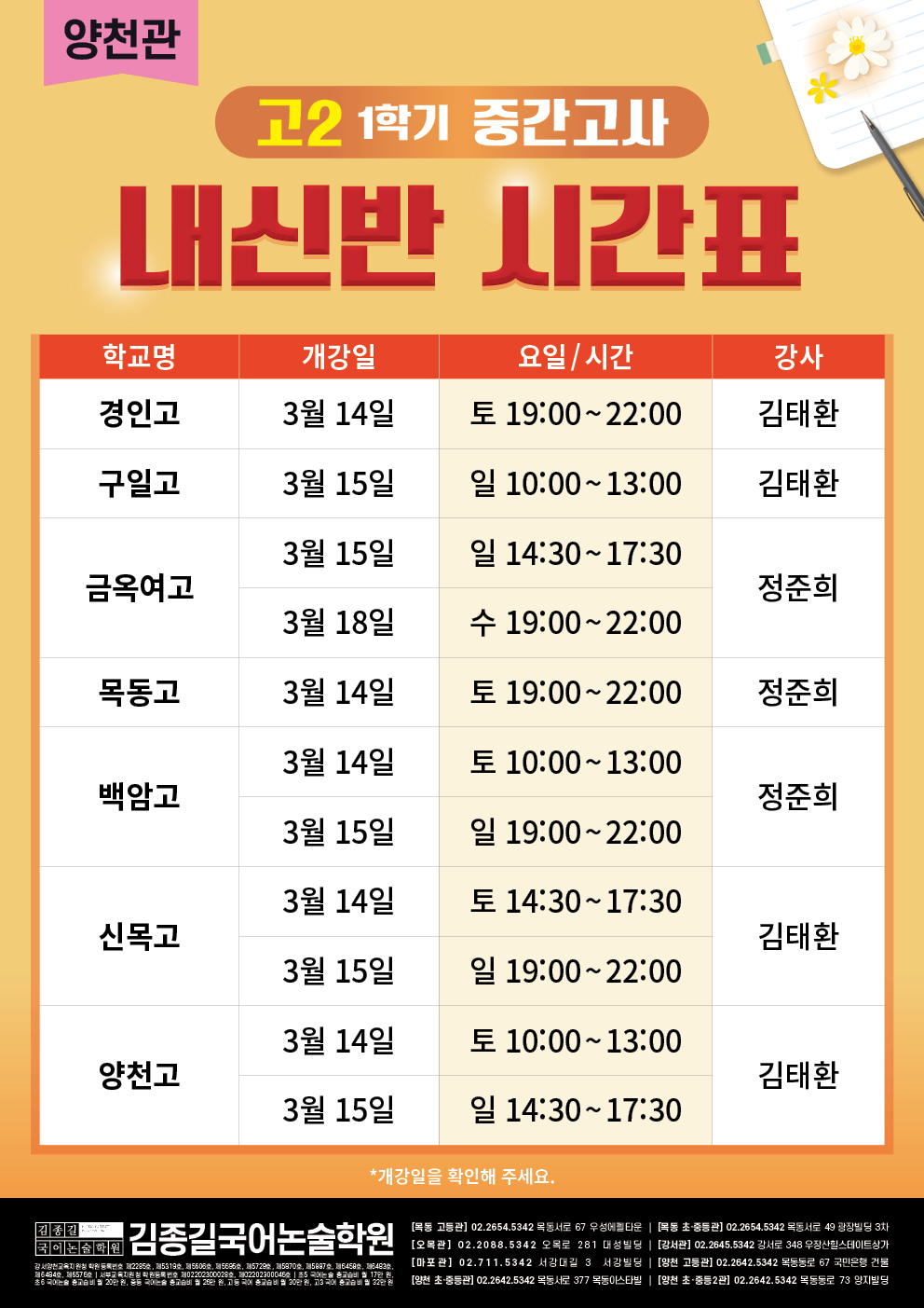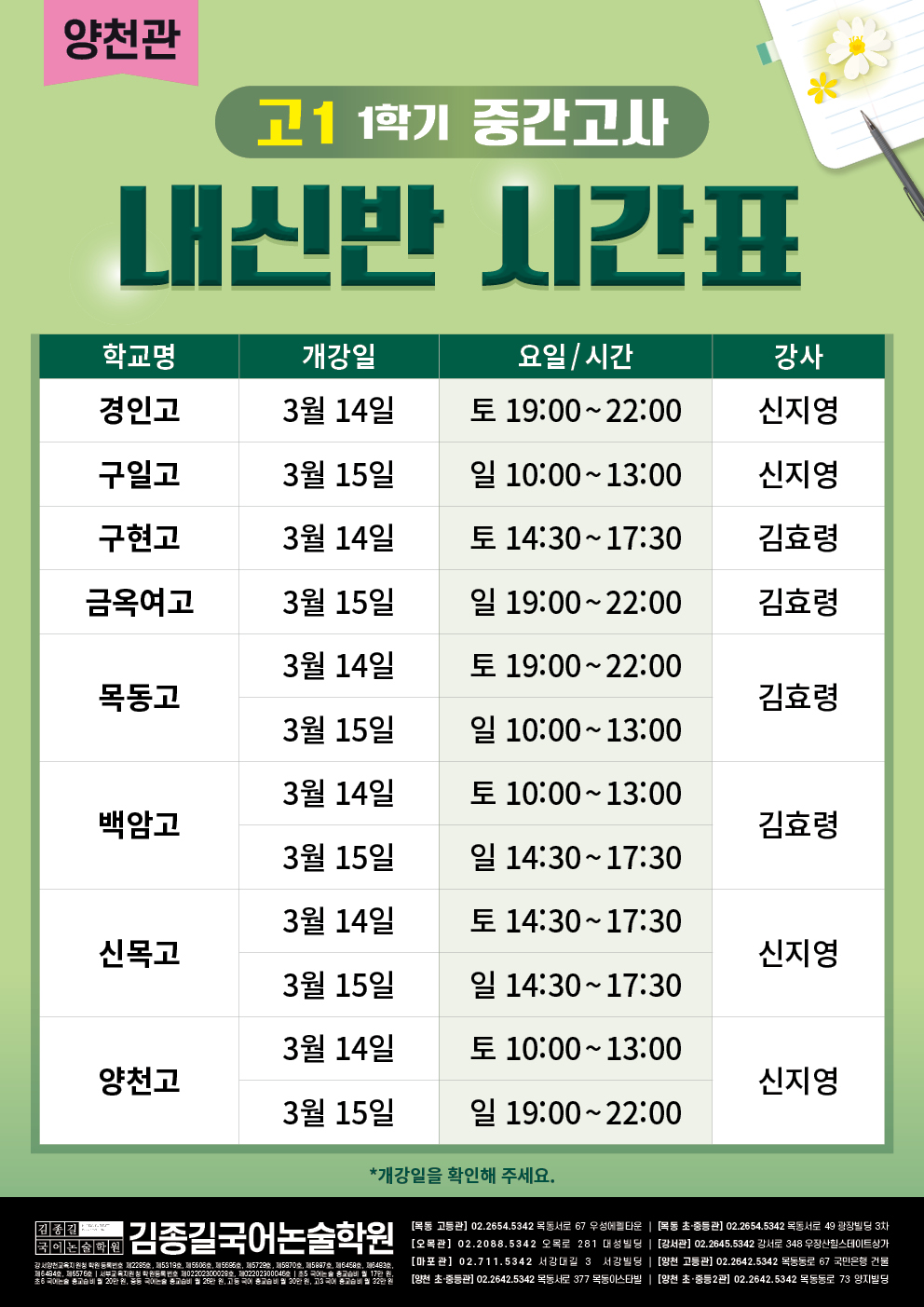 [양천관] 고등 1학기 중간고사 내신반 시간표