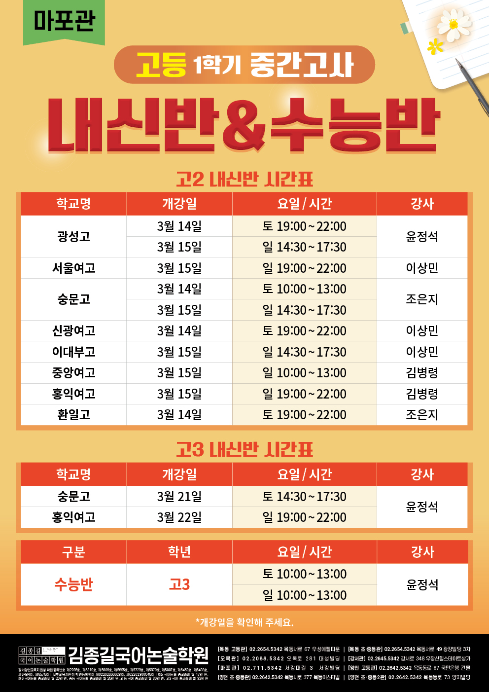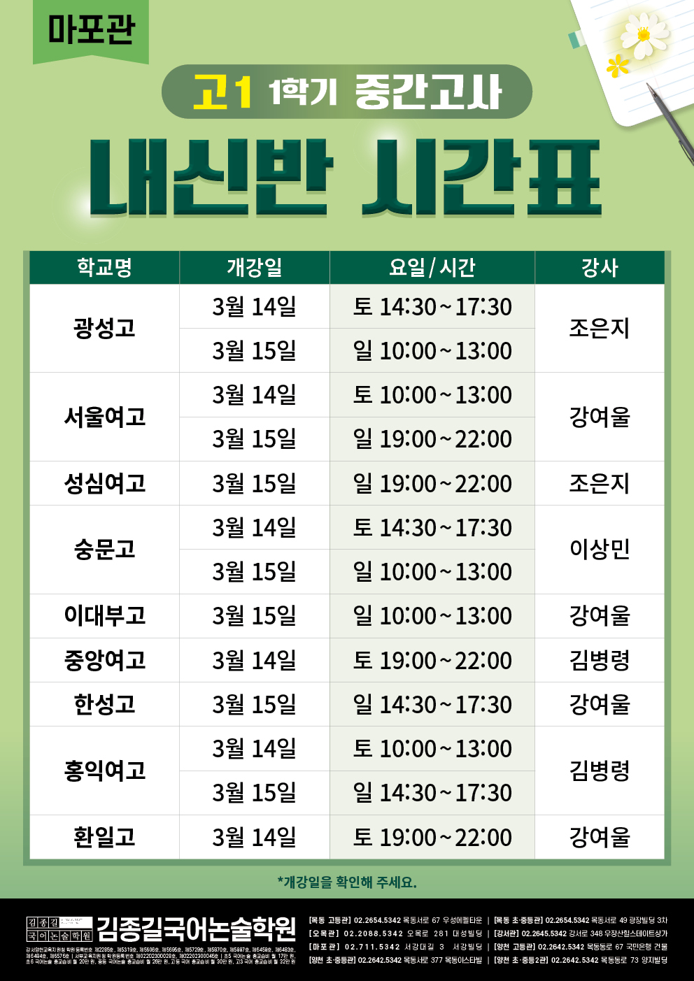 [마포관] 고등 1학기 중간고사 내신반 시간표