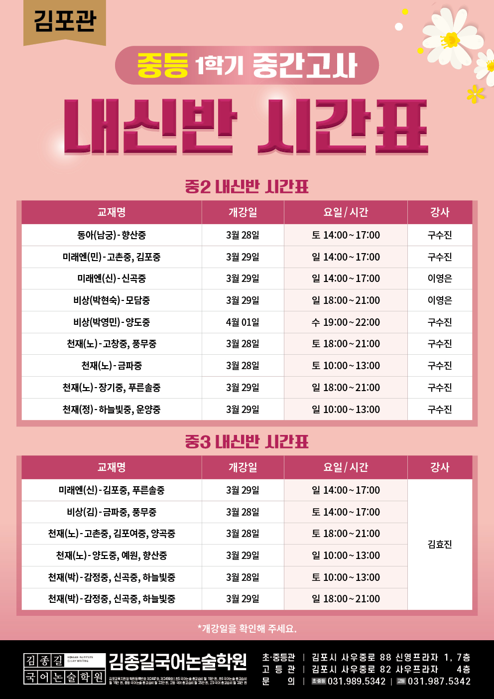 [김포관] 중등 1학기 중간고사 내신반 시간표